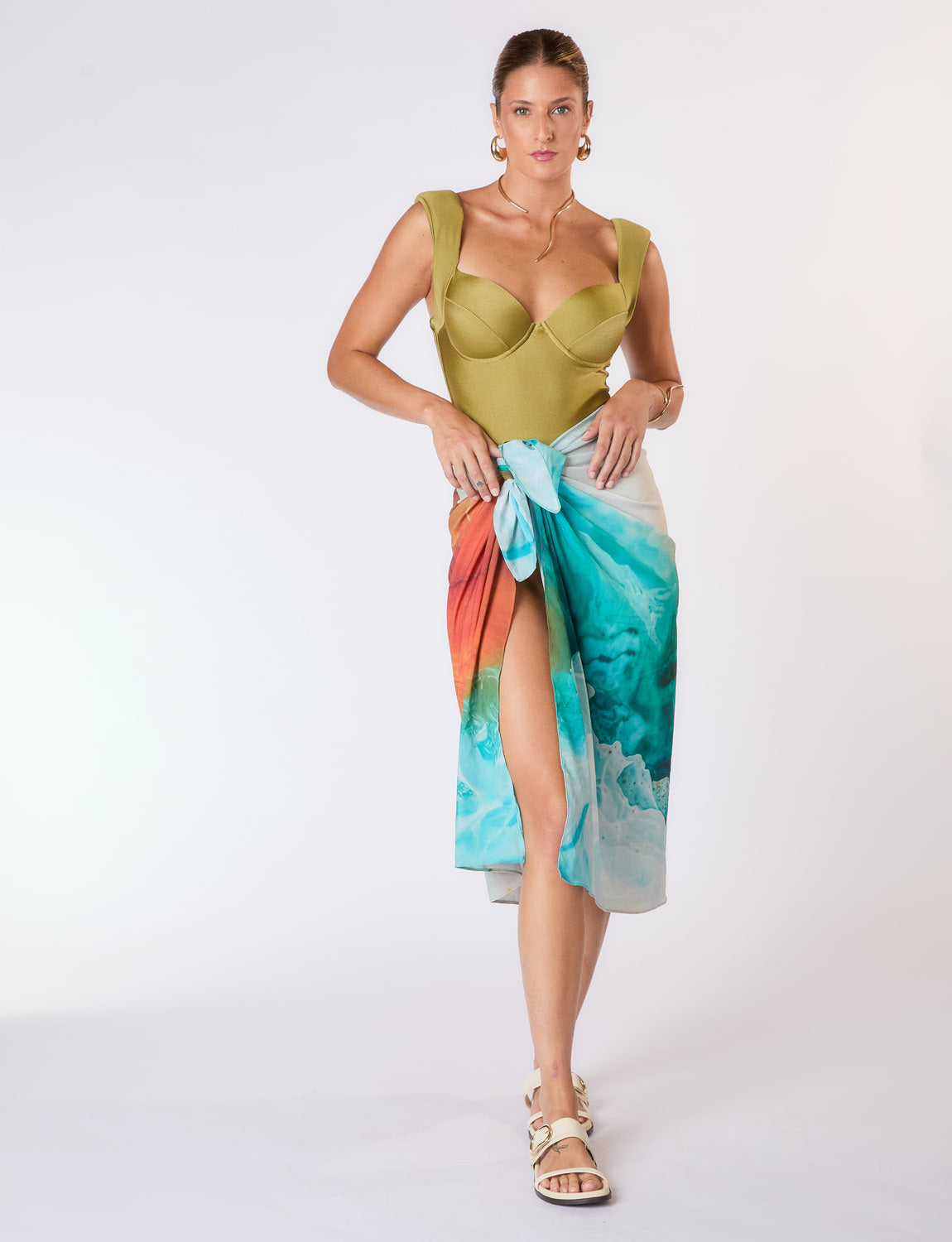 Microfibra Lycra Beach em fios com elasticidade, com recorte estratégico que afinam a silhueta.